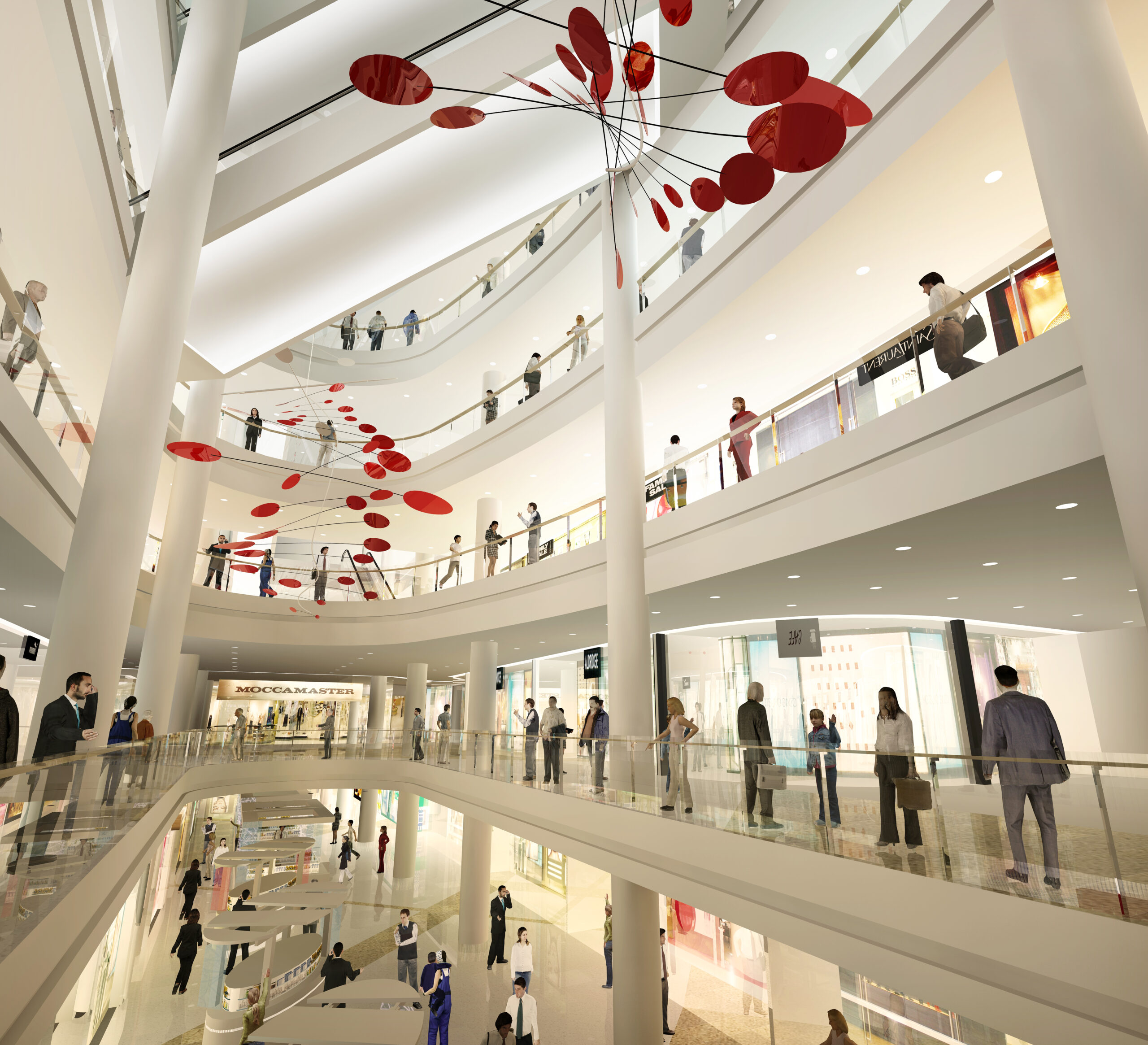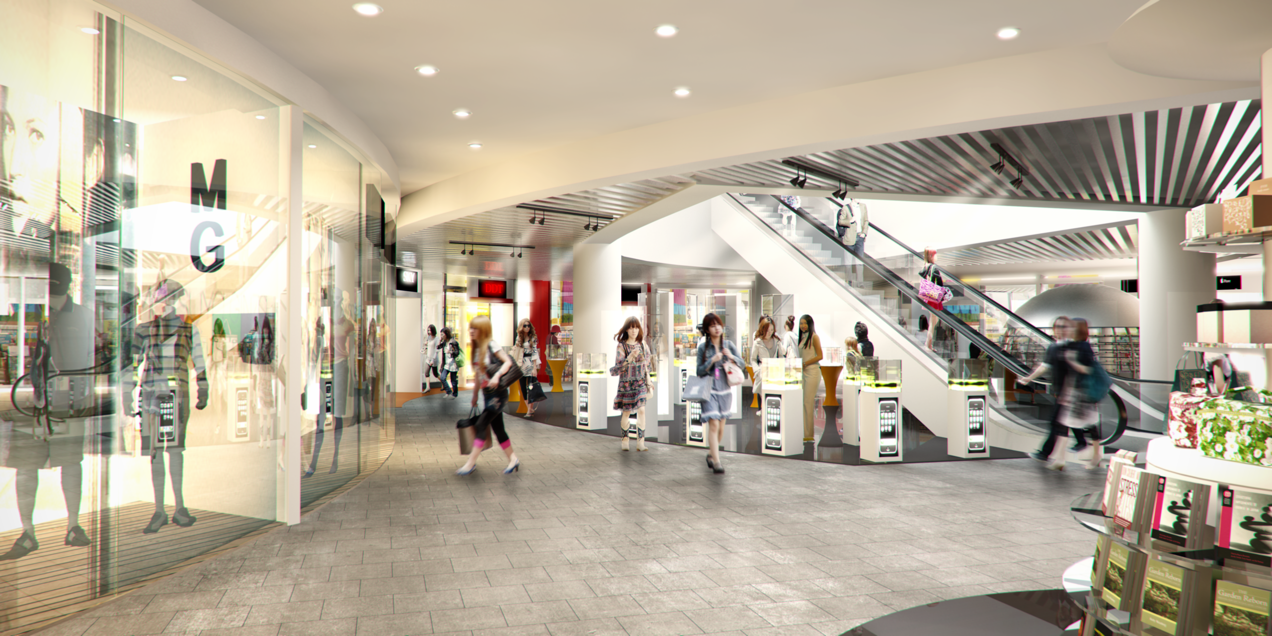 An open and transparent approach to the architecture has been taken that allows dramatic views into the retail areas particularly at night.